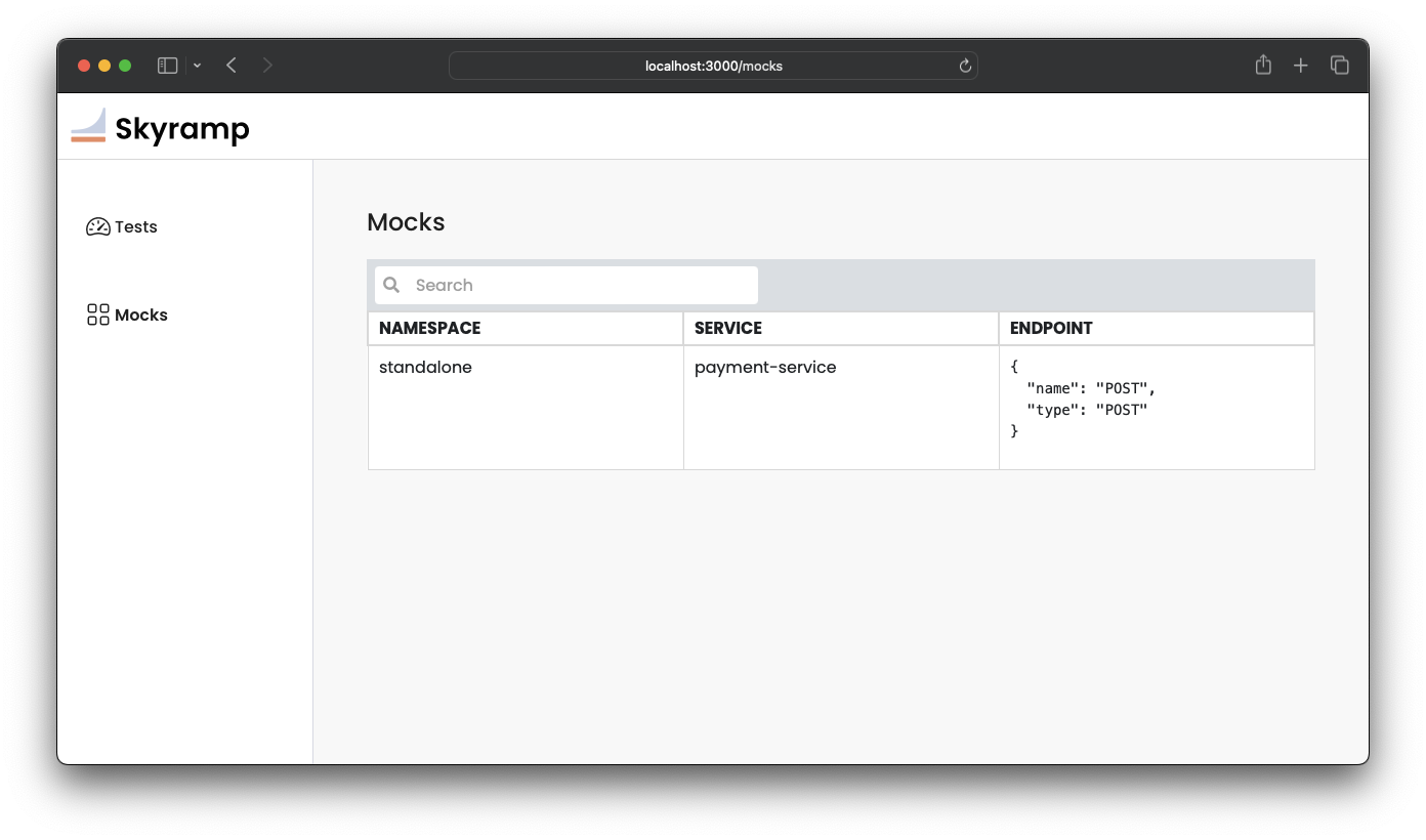 Once your dashboard is running, you can use Mocker to apply mocks in-cluster and track active mocks. For example, if you mock the payment-service with skyramp mocker apply, you can view active mocks and responses in the Mocked Services section: